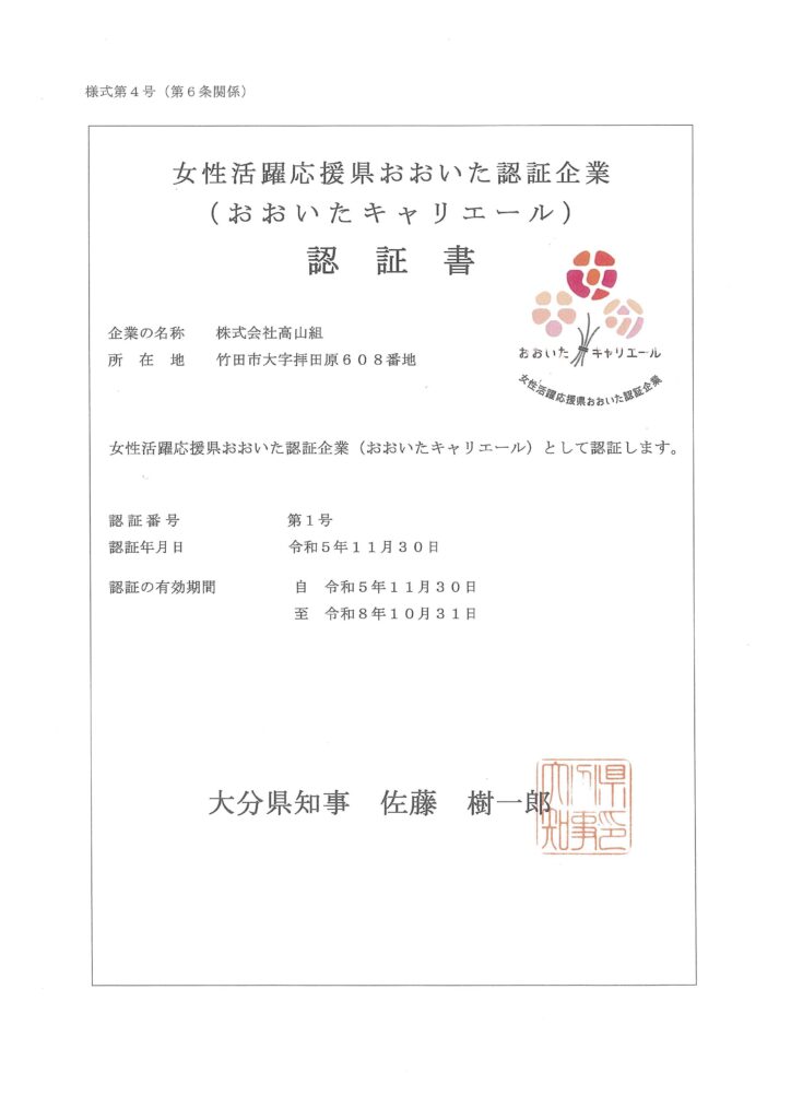 女性活躍応援県おおいた認証企業(おおいたキャリアエール)
